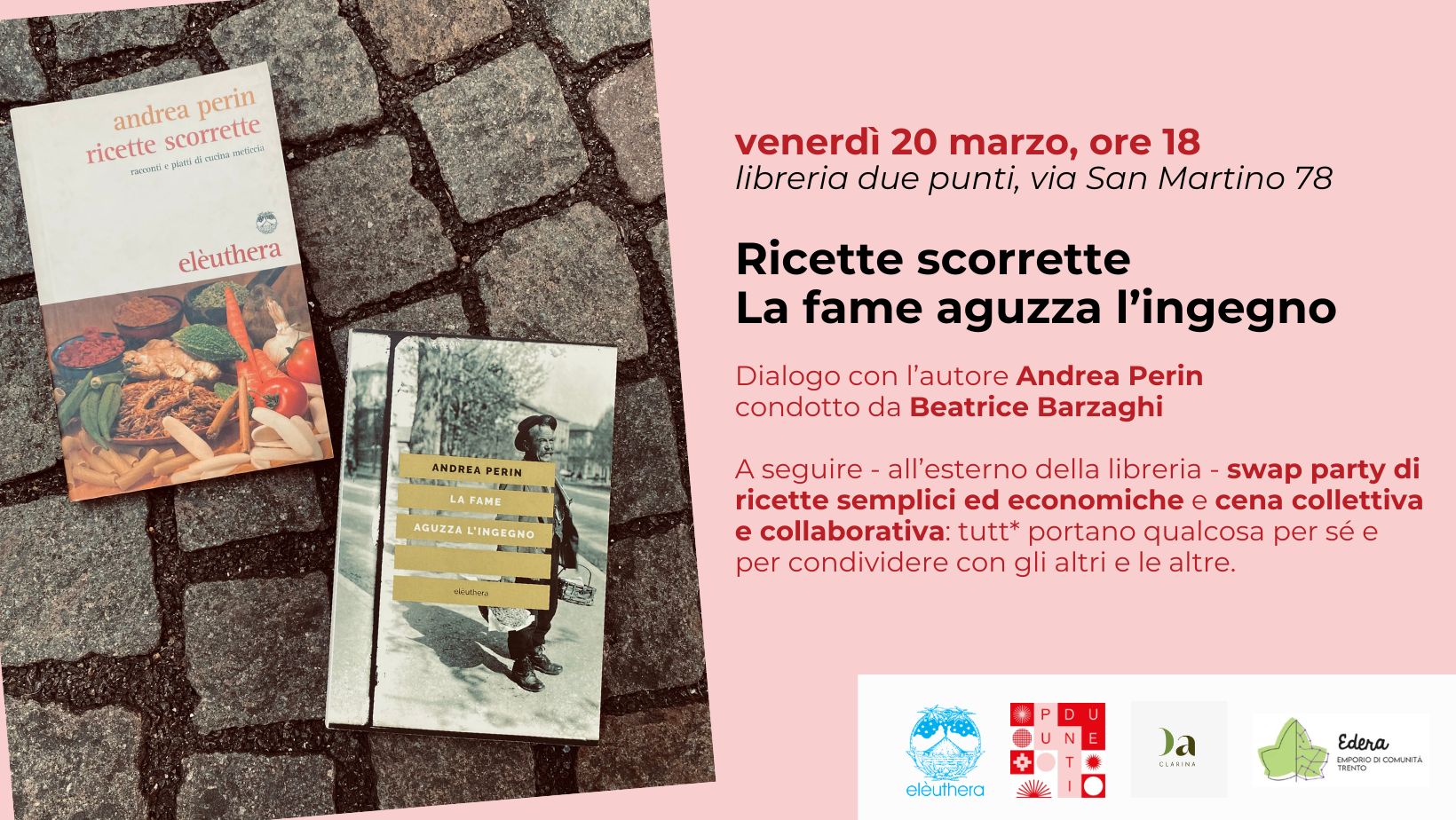 Venerdì 20 marzo alle 18.00, in collaborazione con Libreria due punti e Orto Aperto Clarina, presso la libreria in via San Martino 78, saremo alla presentazione dei libri “Ricette Scorrette” e “La fame aguzza l’ingegno” in compagnia dell’autore Andrea Perin.